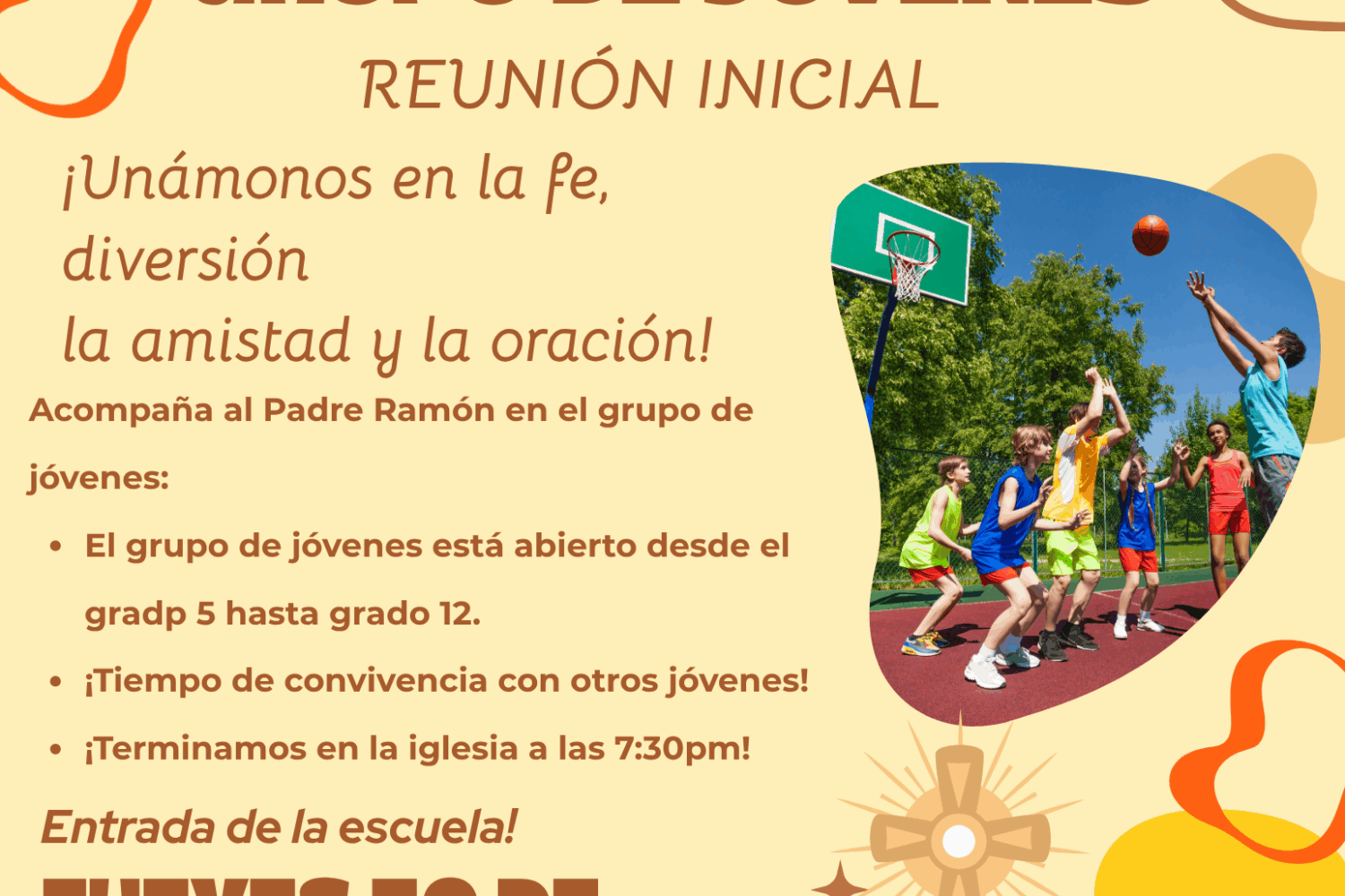 ¡El Grupo de Jóvenes ha VUELTO! ¡Únete al Padre Ramón para una tarde llena de diversión, oración y amistad entre nosotros y con el SEÑOR! ¡La reunión será el jueves 30 de octubre de 5:30 pm a 7:30 pm! ¡Los esperamos!