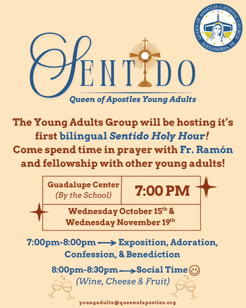 El Grupo de Jóvenes Adultos organizará su primera Hora Santa Sentido el miércoles 15 de octubre a las 7:00 p.m. en la capilla del Centro Guadalupe, junto a la escuela. Se invita a todos los jóvenes adultos a participar. Para más información, escribe a youngadults@queenofapostles.org.