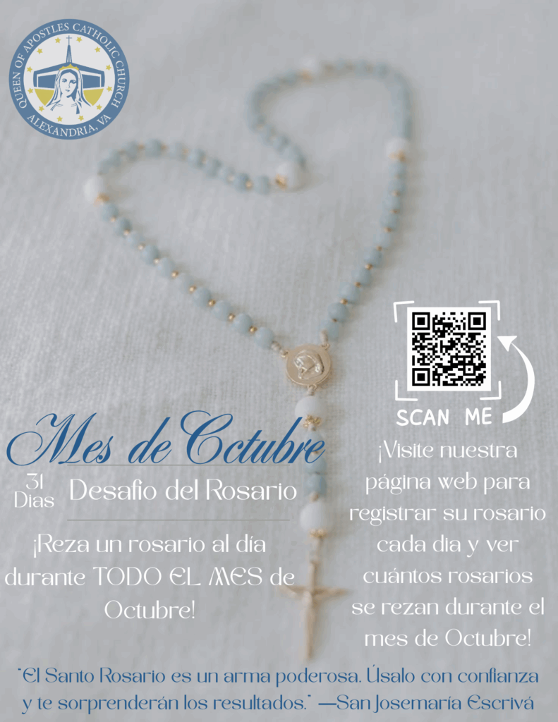 Palabras de nuestro Párroco Padre Alex: “El Santo Rosario es un arma poderosa contra las asechanzas del mal; es tan poderoso que desarma al demonio y cambia los corazones tibios en corazones ardientes, y enamorados de Jesús nuestro Señor. Cuando lo rezamos con devoción nos vamos configurando con el Señor. Según los testimonios de Sor Lucia, vidente en Fátima, cuando lo rezamos con amor, el cielo se abre y se derraman muchas gracias sobre la persona que lo reza. Por tal razón, es importante el orarlo con amor, desgranar esas aves marías con alegría y entusiasmo, sabiendo que apaleamos y destruimos toda acechanza del demonio.“
