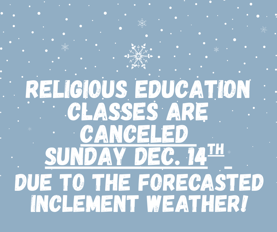 Due to the inclement weather forecasted for early tomorrow morning, Religious Education classes are cancelled Sunday December 14th.